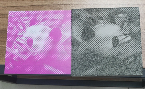 原理:將圖片處理后使用印刷設(shè)備印刷到 防水紙或膜上,其中印刷油墨中包含特殊的水泥緩凝劑,制成緩凝成像膜。再使用緩凝成像膜制作混凝土板,使得混凝土板上圖案區(qū)域骨料露出,與無圖案部分的水泥基色形成對(duì)比,產(chǎn)生圖案效果。圖案由圖案部分露出的骨料與無圖案部分正常水泥石的顏色色差對(duì)比形成。緩凝成像技術(shù)制成的圖像混凝土,圖案從任意角度觀察都清晰可見。
